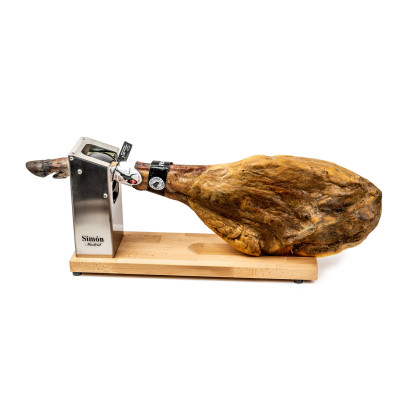 Soporte para sujetar el jamón con herraje de acero inoxidable pulido con sistema de rótula para sujeción del jamón en pata con sistema de suspensión. Evita la oxidación del jamón. Base de madera de haya vaporizada con topes atornillados a 60cm.DETALLE DEL PRODUCTOFabricado en:España Realizado e..